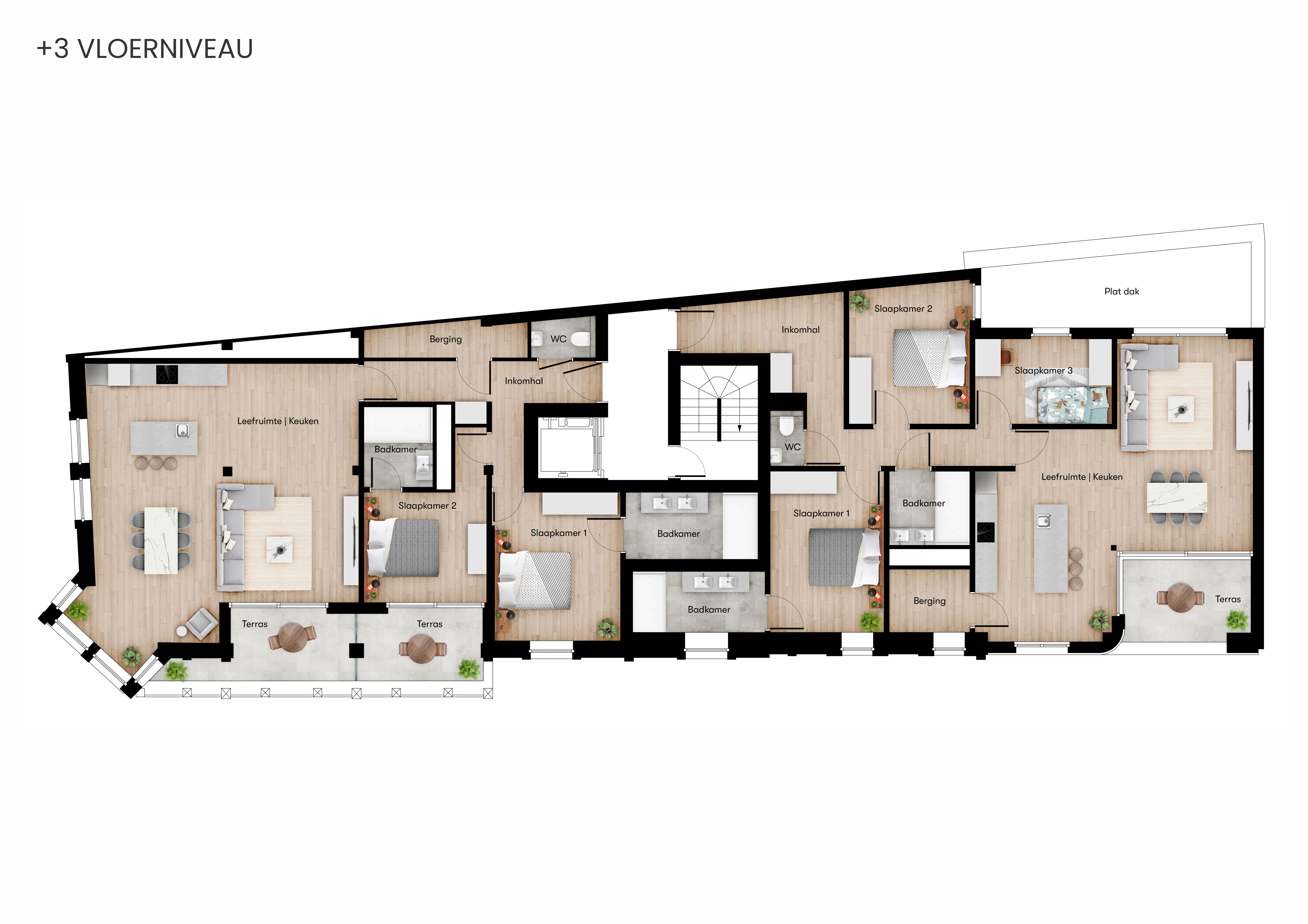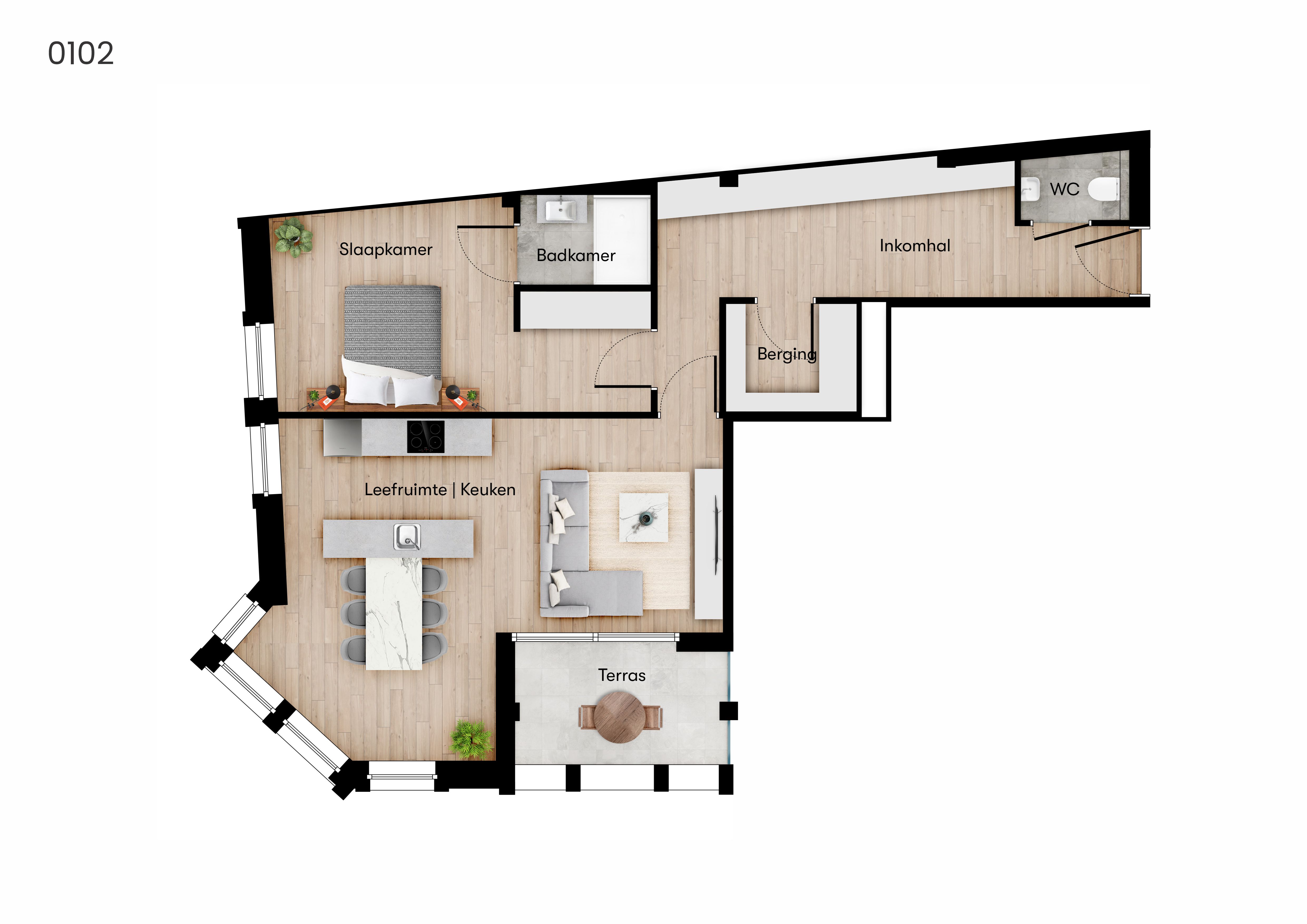 Ruime, lichtrijke appartementen met 1 of 2 slaapkamers. Elk appartement heeft bovendien een terras, bergruimte en privé kelder. (Elk appartement beschikt over een eigen oplader met betrekking tot elektrische fietsen) Je kan zelf nog beslissen over de afwerking en keuze van de badkamer en keuken.