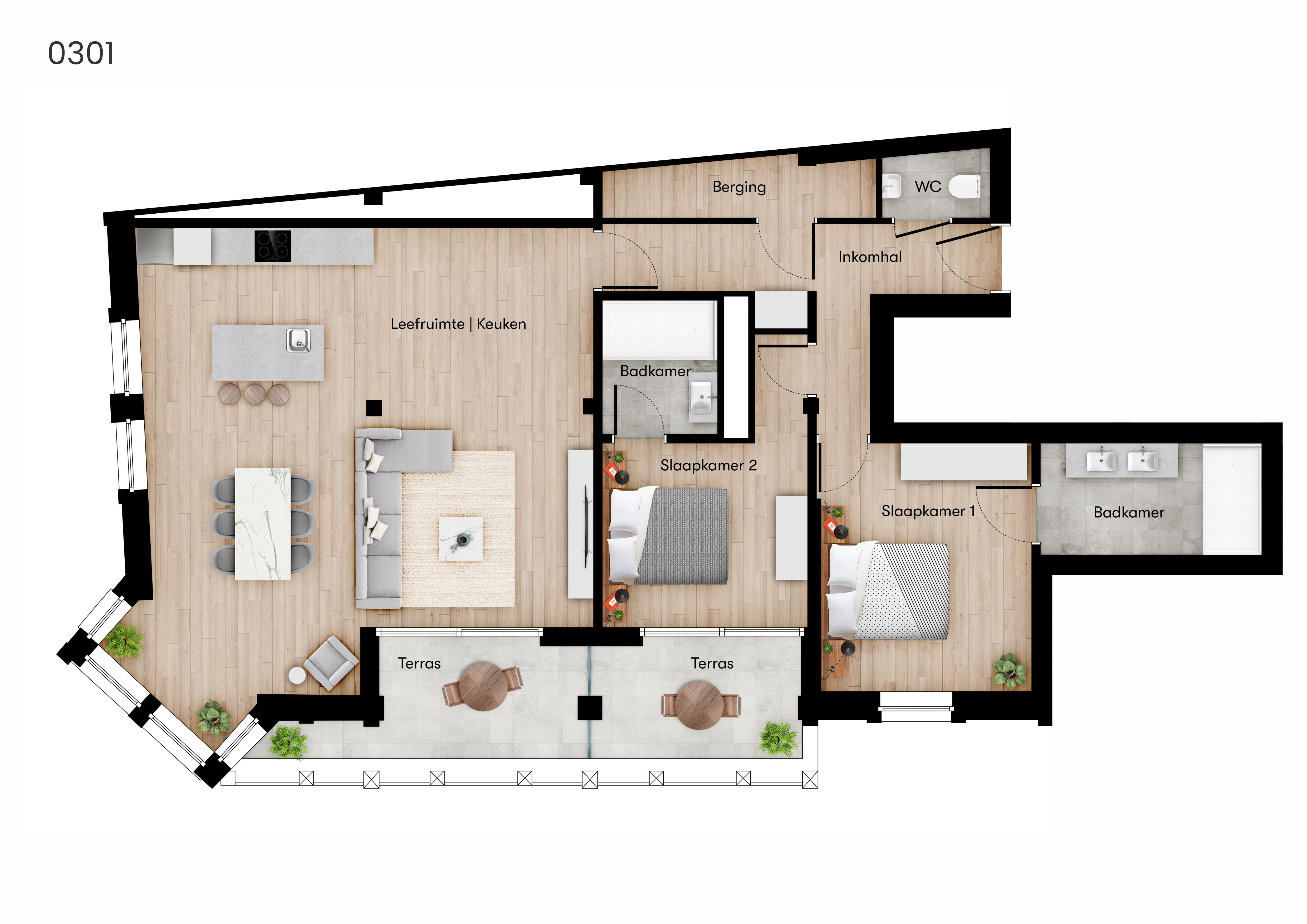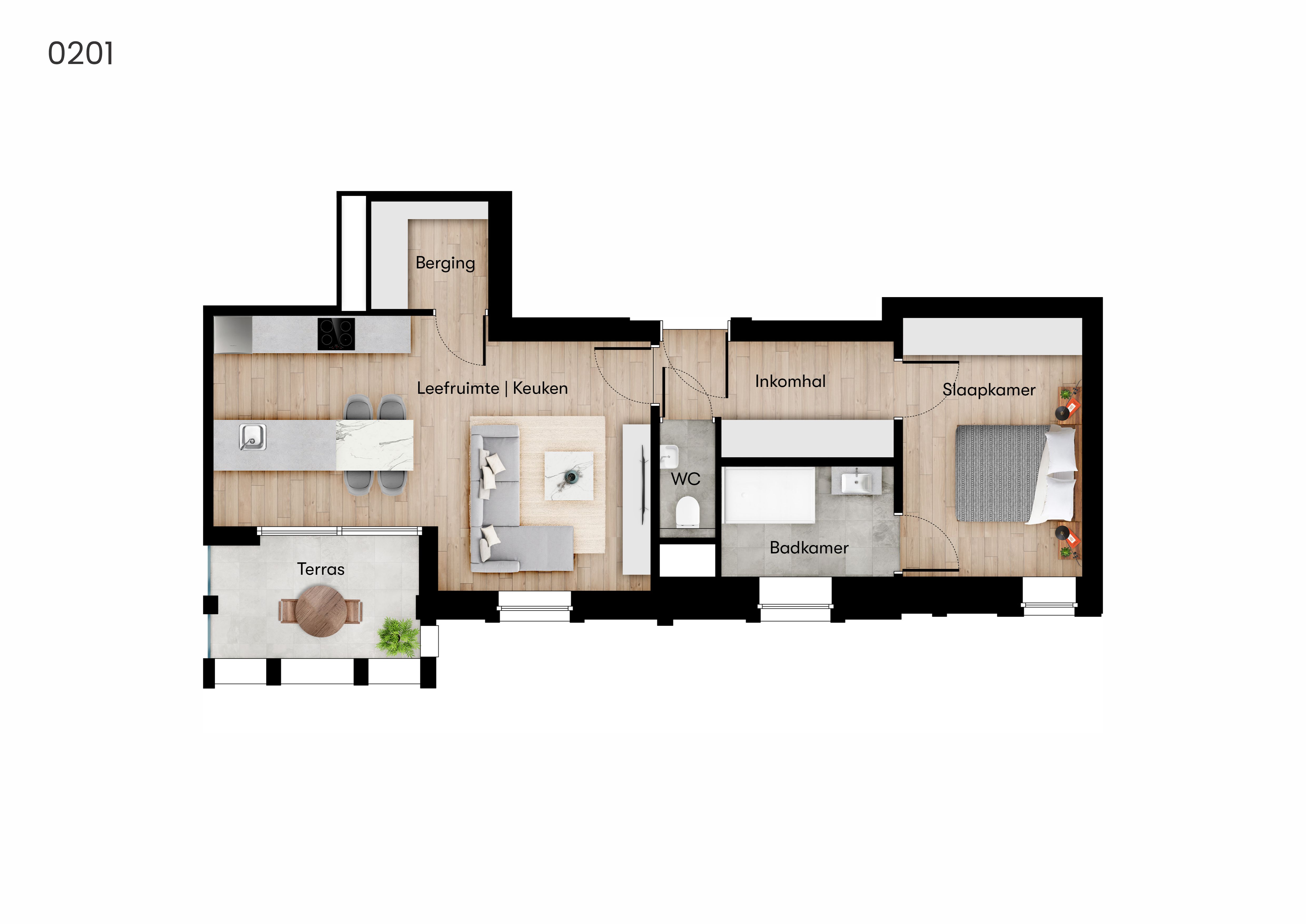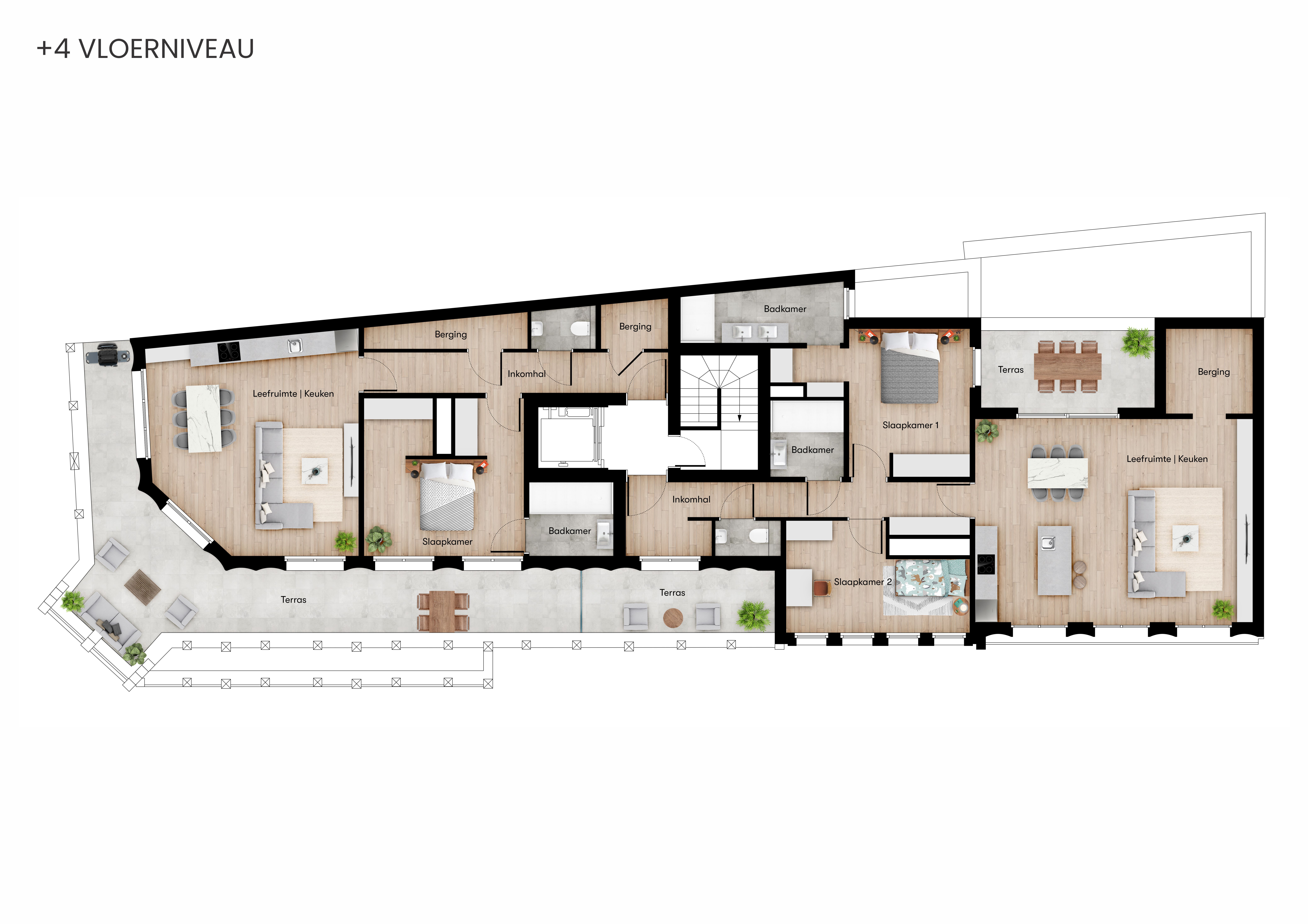 Ruime, lichtrijke appartementen met 1 of 2 slaapkamers. Elk appartement heeft bovendien een terras, bergruimte en privé kelder. (Elk appartement beschikt over een eigen oplader met betrekking tot elektrische fietsen) Je kan zelf nog beslissen over de afwerking en keuze van de badkamer en keuken.